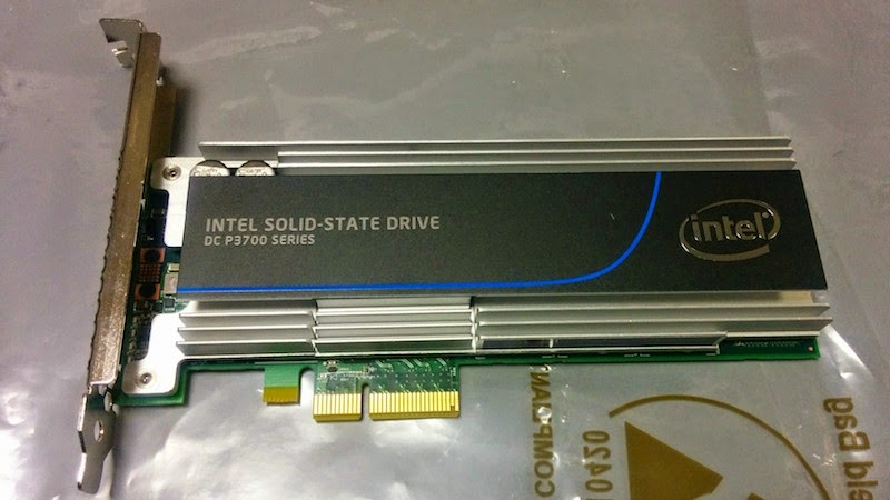 IntelのPCI express typeのSSD DC P3700です。大きなヒートシンクに囲われていて、かっこいいですね!まあ、どんだけ熱くなるんだってお話もありますが。。。