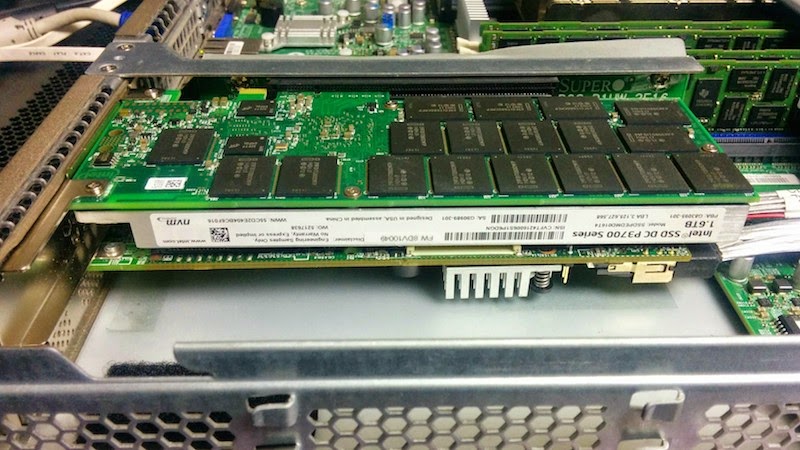 こんな風に、サーバのPCIeスロットに装着します。ちょっと、見えづらいかも知れませんが、この1Uサイズのサーバは、PCIeスロットが二段になっていて、上段がP3700、下段がLSI RAIDカードとなっています。