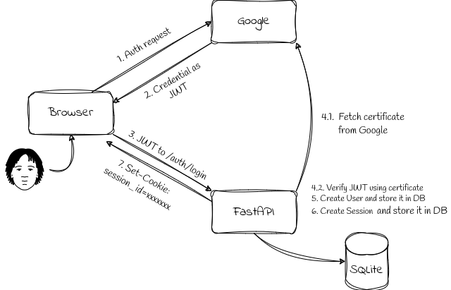 In this post, I’ve shared what I learned about integrating the Sign in with Google feature with an HTMX+FastAPI web application. The “Sign in with Google” button has been successfully integrated into a sample HTMX+FastAPI web application. We included either an HTML or JavaScript version of a code snippet from Google’s code generator in the HTML to display the button. The FastAPI backend has been configured to create a session from the JWT and set “Set-Cookie: session_id” in the header, allowing subsequent communications to maintain the login status through a session cookie. Thanks to HTMX functionality, the application page can dynamically update the navigation bar upon a change in login status, clearly indicating whether the user is logged in.