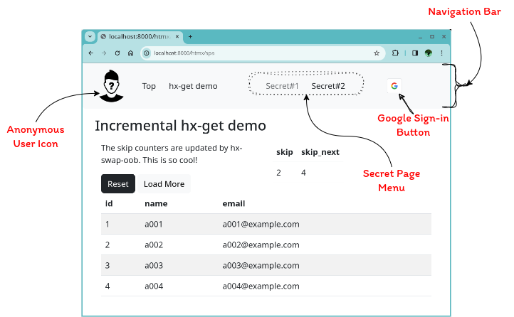 The section below the navigation bar is the content section showing the “Incremental hx-get demo” page, which is accessible by both anonymous and authenticated users.