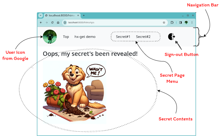 The figure below shows a screenshot of the authenticated user page, which also consists of a navigation bar and content section. Shown on the navigation bar are the user’s Google account icon, menus including the ones to secret pages, and a Sign-out button. When the user is authenticated, the menus to the secret pages are both accessible and return the contents.