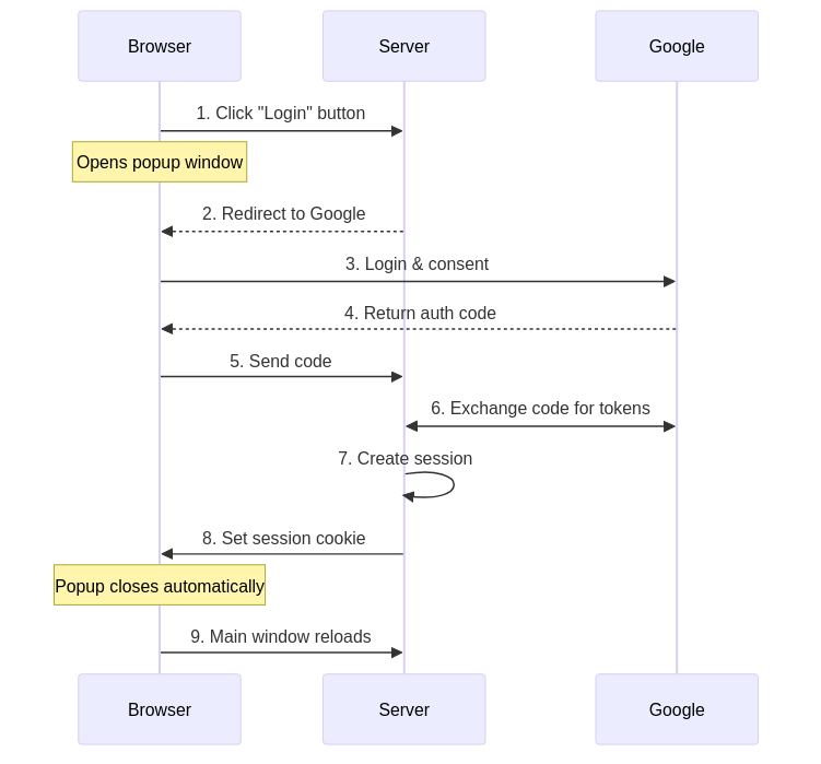 The process begins when a user clicks the login button, which opens a popup and redirects to Google’s authentication page. After a successful login, Google returns an authorization code that the server exchanges for tokens. The server verifies ID token, creates a user session, and sets a session cookie in the response to the browser, completing the authentication flow. The user is subsequently identified by this cookie in all future requests.