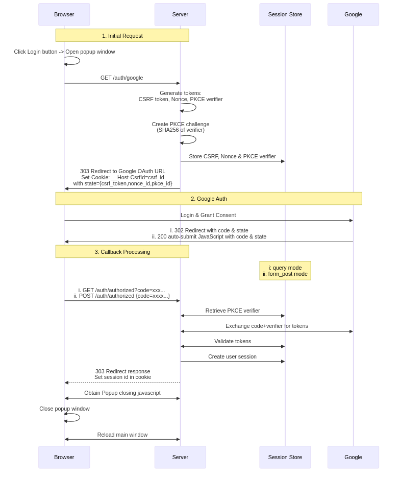 The flow coordinates between four components: browser, server, Google, and session store. The session store manages login sessions and security tokens (CSRF, nonce, PKCE verifier).